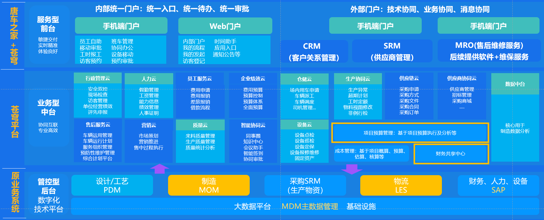 为促进中车唐山公司统一管理落地,从传统制造业向数字化转型,构建服务型前台、业务型中台两大数字化管理平台,设计总体应用架构如下: