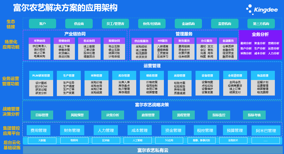 金蝶云星空+云之家移动办公系统为富尔农艺提供了稳定的业务中、后台,针对行业特性进行二次开发了农资收购系统、检斤系统等行业特性模块,使得富尔农艺公司在实际业务运营中从农户收购—仓储回运—生产加工—质量追溯—全渠道营销—终端物流的高效协同,通过云之家移动办公实时业务处理与监管,实现内部集中管控向外部业务协同的数字化转型升级。