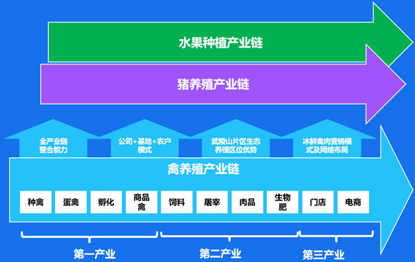 湘佳牧业禽养殖产业链数字化平台,支撑企业复制全产业链整合能力、公司+基地+农户模式、武陵山片区生态养殖区位优势、冰鲜禽肉营销模式及网络布局,强势切入猪养殖、水果种植板块,贯穿现代农业3大产业5大品类。
