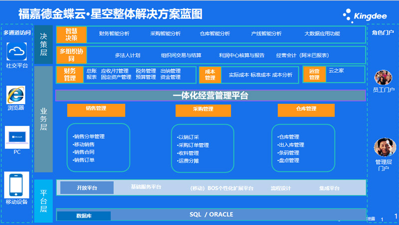 福嘉德金蝶云·星空解决方案,以一体化为目标,以业务流程为主线,以赋能业务为宗旨,以数据驱动为核心,通过平台建设,提升集团协同效率,加强财务管控,通过数据共享让营销更精准、采购更经济、交付更高效。