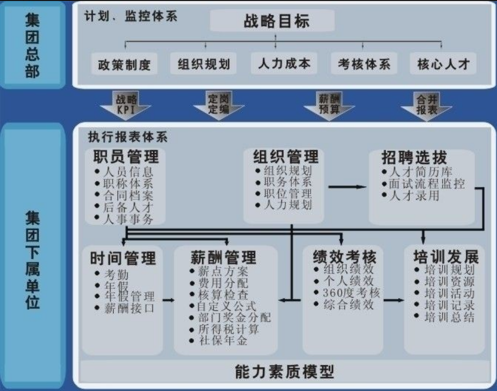 通过对人力资源组织结构的再设计,使以传统职能划分的组织架构转变为以能力素质为牵引的面向业务客户的新型组织架构。在重建后的组织架构中,明确了集团总部和集团下属单位的管理职责,集团总部人力资源主要包含五个模块:政策制度、组织规划、人力成本、考核体系、核心人力,而集团下属单位将贯穿以能力素质为导向组织文化开展人力资源工作,使基础事务集中处理,发挥规模效应,降低管理成本,从而实现了支撑业务和总部人力资源战略性工作。