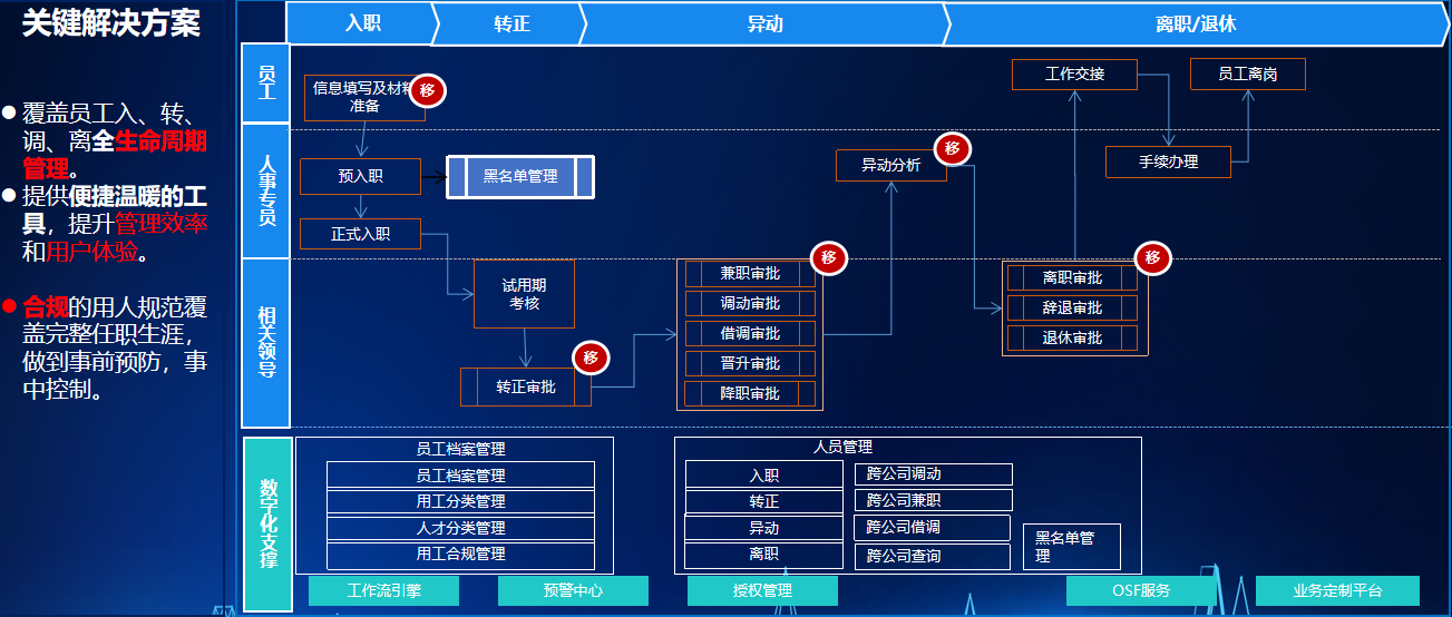 链接员工能力:通过“制度流程化、流程系统化、系统数据化”的⽅式将HR运营流程落实到数字化系统平台中,过程迭代,向⾼价值工作逐步释放更多精力以“用户为中⼼”的原则,落实数字化服务体验。