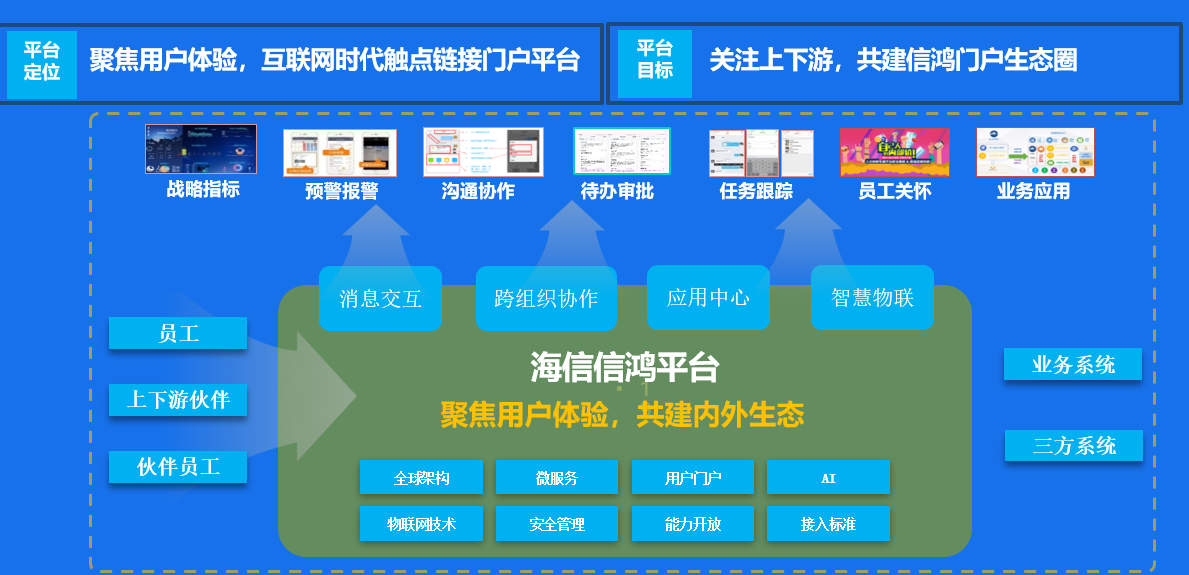 海信信鸿平台旨在打造聚焦用户体验、互联网链接触点的门户平台。平台通过建设基础业务能力,赋能用户和上下游企业,打造内外生态,实现实际业务场景支持,为海信集团提供智能、高效、便捷、安全的办公平台体验。