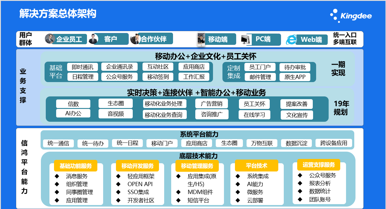 根据业务需求和技术发展,信鸿从移动办公延伸至业务领域,围绕“助力经营决策、连接上下游伙伴、赋能一线员工、AI智能、音视频”等方面,助力海信内外9万用户进入移动业务、智能办公模式。主要解决以下问题: