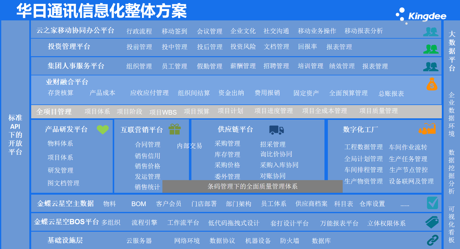 结合行业洞察分析和对企业自身企情况及能力的调研,金蝶认为华日通讯需要建立业务平台和运营管控平台,实现深耕产业下的产业链数字化重塑的双轮驱动。从集团管控和业务协同双向指标逐步建立起华日通讯的IT构建架构。金蝶认为,解决华日通讯当前面临的挑战,可以基于金蝶云星空平台的项目管理平台,通过该项目管理平台对项目实现事前预测、事中监督控制、事后分析的一体化管理,完善企业项目业务的全面协同和信息共享体系。