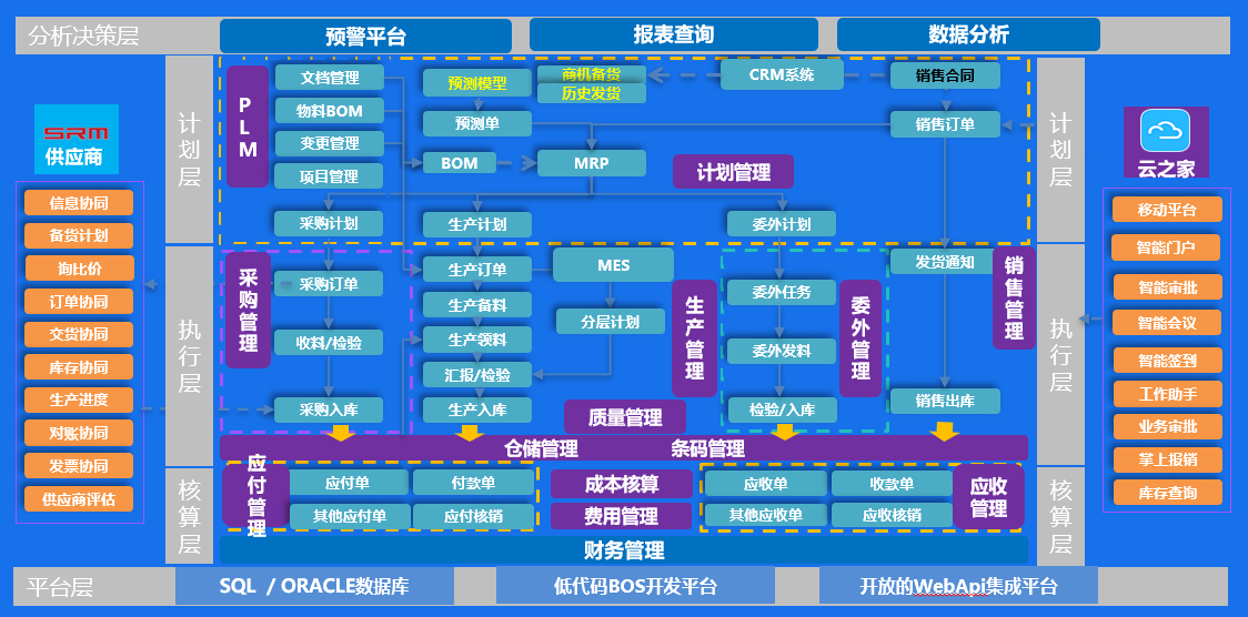 同时,项目实现了EBC五大链接:链接伙伴、链接客户、链接员工、链接设备和数据服务。信息化建设过程中链接100+家供应商到供应协同平台中;通过CRM集成覆盖并链接客户3300+家,通过云之家、掌上报销全员应用等,服务全公司90%以上员工;应用PLM实现研产供销一体化;搭建智能预测模型,为企业平衡备货和产能提供数字化支撑;应用轻分析平台使企业实现自主定制数据分析报表。与MES、APS系统对接,进一步精细化生产执行过程,满足企业智能制造车间快速运转的高效协同。