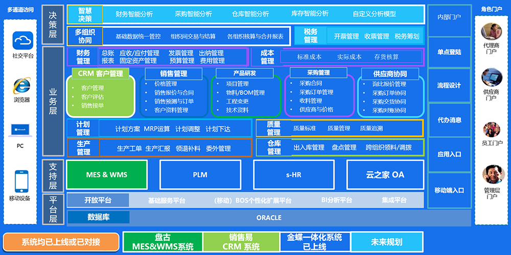 集团化、一体化、智能化是清越运营数字化转型的关键,金蝶云系统平台作为清越科技数智平台的核心,对业务领域的信息化进行全面补缺优化。金蝶云·星空作为集团统一的主数据中心,支撑了集团研、产、供、销等核心业务,实现了集团及分子公司的多法人、多工厂、多地域的集团管控要求,业务与财务一体化,生产成本精细化管控;实现了CRM、WMS、MES、s-HR与金蝶云·星空的集成,并以金蝶云之家作为统一门户,建立了满足清越科技发展的一体化数字管理平台,为未来智能化打下了坚实的基础。