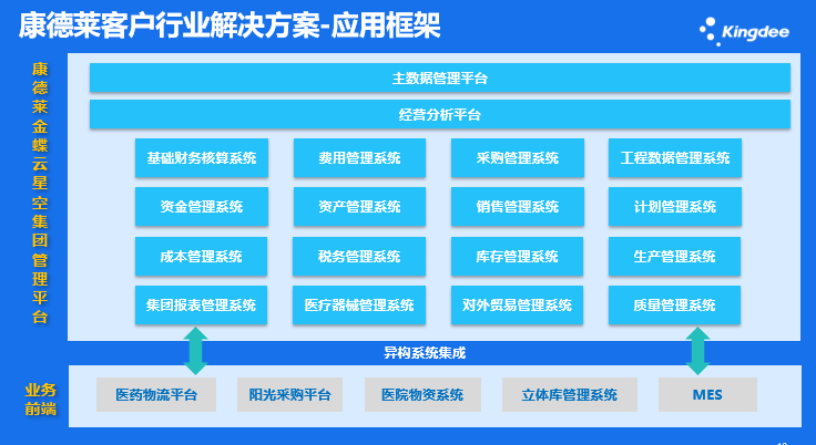 康德莱由于所处行业与其发展阶段,其本次数字化转型围绕着集团管控、合规质控、持续降本几个重点进行展开,其方案设计理念是:在业务、业财一体化平台的基础之上,着重建设GSP\GMP\UDI行业特性、标准成本,对外贸易等信息化应用。